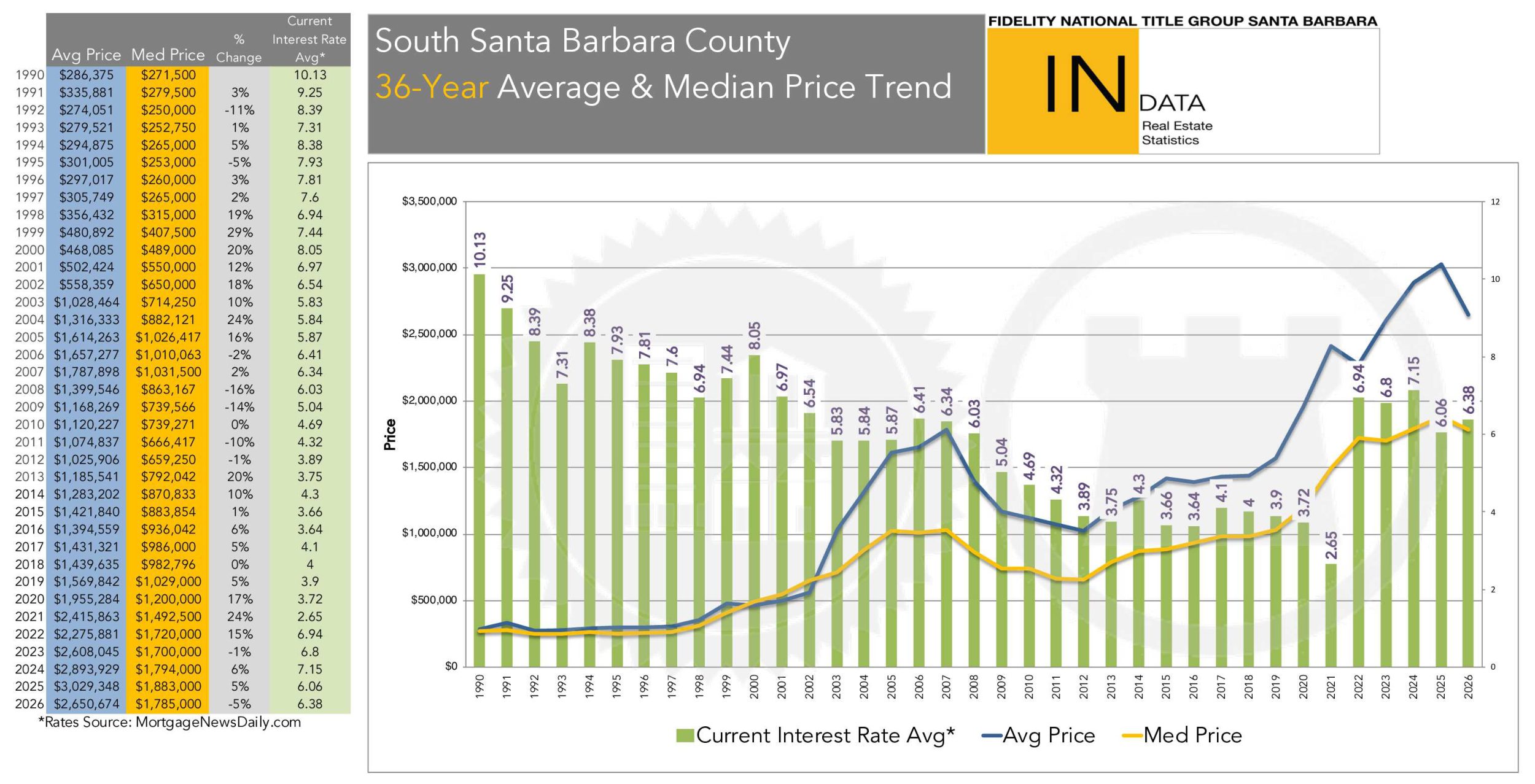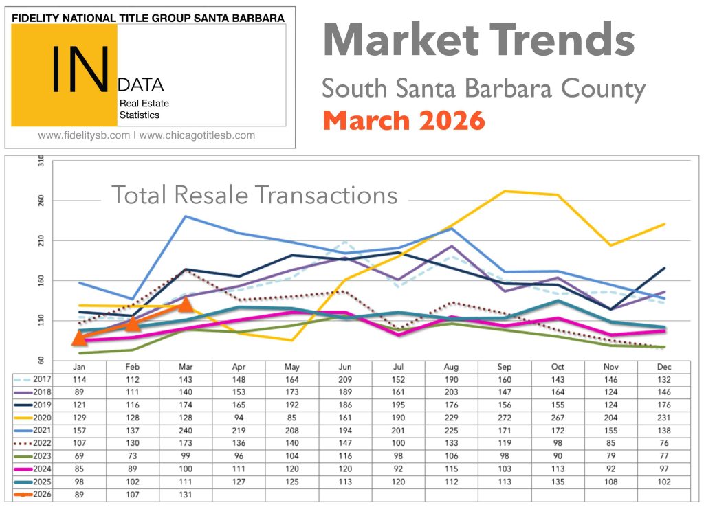 According to data from the County Recorder’s Office by way of Fidelity National Title, the number of residential property sales on the Santa Barbara South Coast increased by 18% in March 2026, with 131 sales as compared with March 2025. Of these 131 sales, there were 99 House or Planned Unit Developments (PUDs) sales, up from 79 in March 2025; the median sale price of these House/PUD sales was $2,225,000, down 21% from 2025, and the average sale price was $3,456,232, down 20% from 2025. Of these 131 sales, there were 32 Condominium sales in March 2026, the same number as in 2025; the median sale price of these Condominium sales was $1,150,000, down 3% from 2025, and the average sale price was $1,288,122, down 3% from 2025.